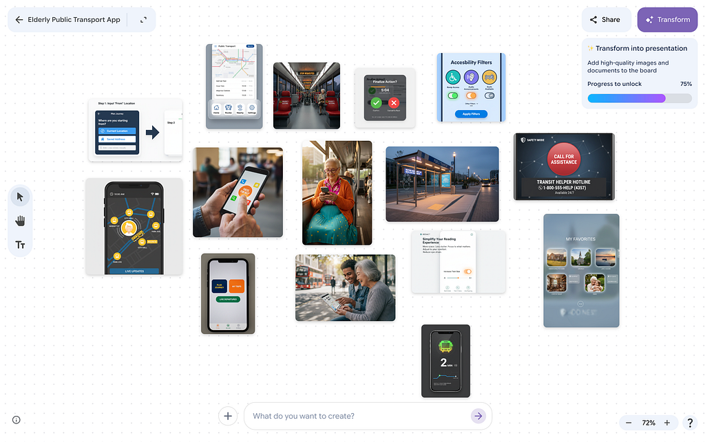 How Mixboard works: You submit a prompt and let the tool generate imagery for you. Mixboard will generate various types of images relevant to your task at hand. For example, in my case, for the prompt “Public transport app for elderly people,” it generated both UI mocks and AI-generated photos of senior people using digital products.
