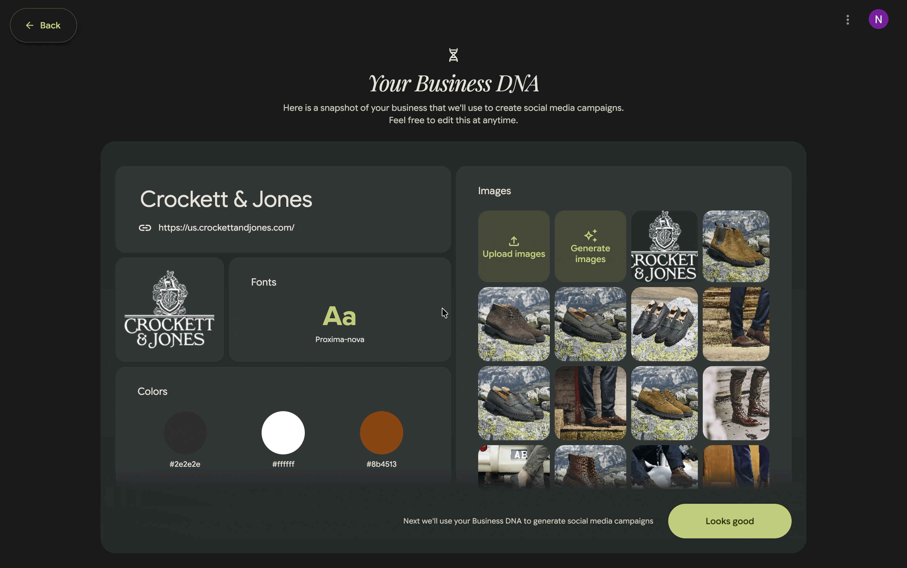 How Pomelli works: Pomelli can help generate visual assets, style palettes, and design ideas that align with brand guidelines. And the great thing is that AI extracts the visual style from your existing brand. You can feed the tool URL of your website, and it will extract your business DNA. Below, you can see how it works for a famous shoe brand.