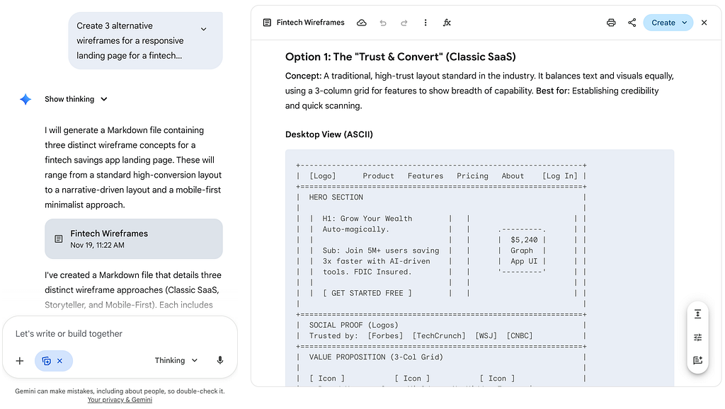 When I submit the prompt, Gemini adds the output directly to the canvas. If you click on Open, you will see the output provided by AI. Quick note: I use ASCII format for wireframes instead of visual sketches because it make it easy to share design. Its basically a plain text formatted using basic text symbols.