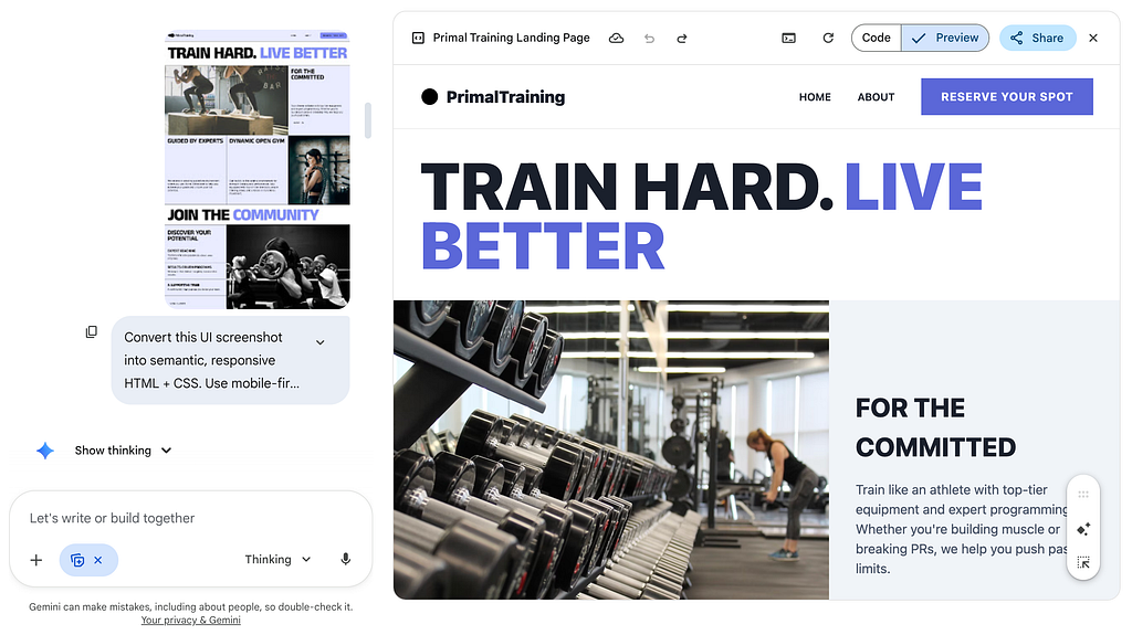 It’s not a one-to-one translation of the design, but it’s pretty close. And the best part is that Gemini outputs the source code, so you can switch to Code tab and copy/adjust code easily.