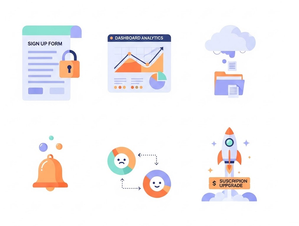 sign up, dashboard analytics, data import, notifications, collaboration,