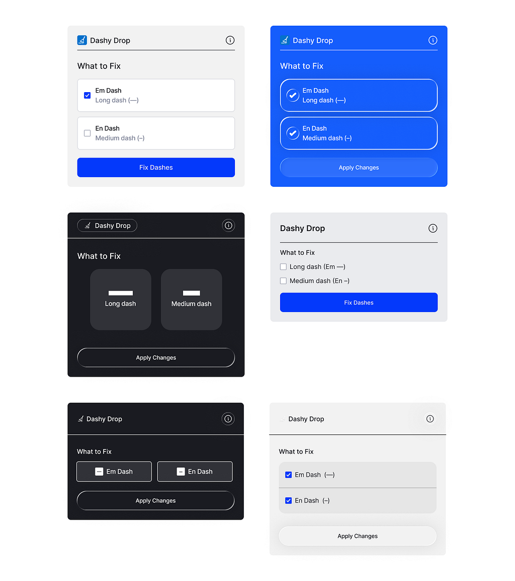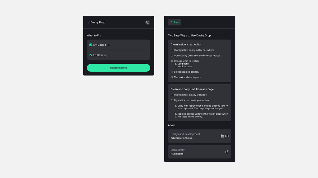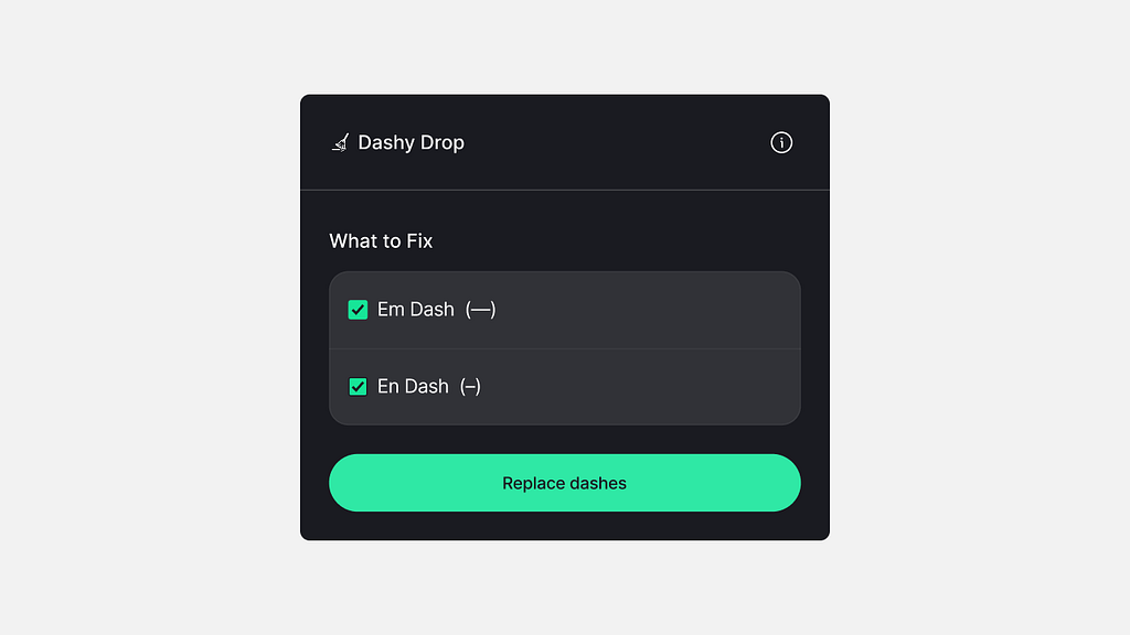 The main screen had one job: let users choose which dashes to fix. Em dash, En dash, or both. Click “Replace dashes.” That’s all. One clear action.