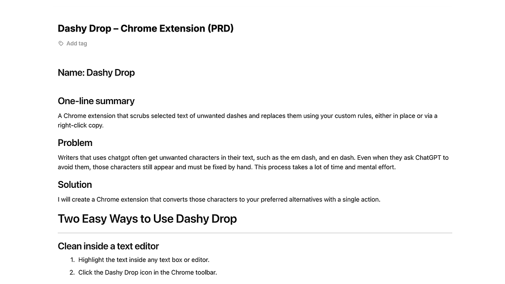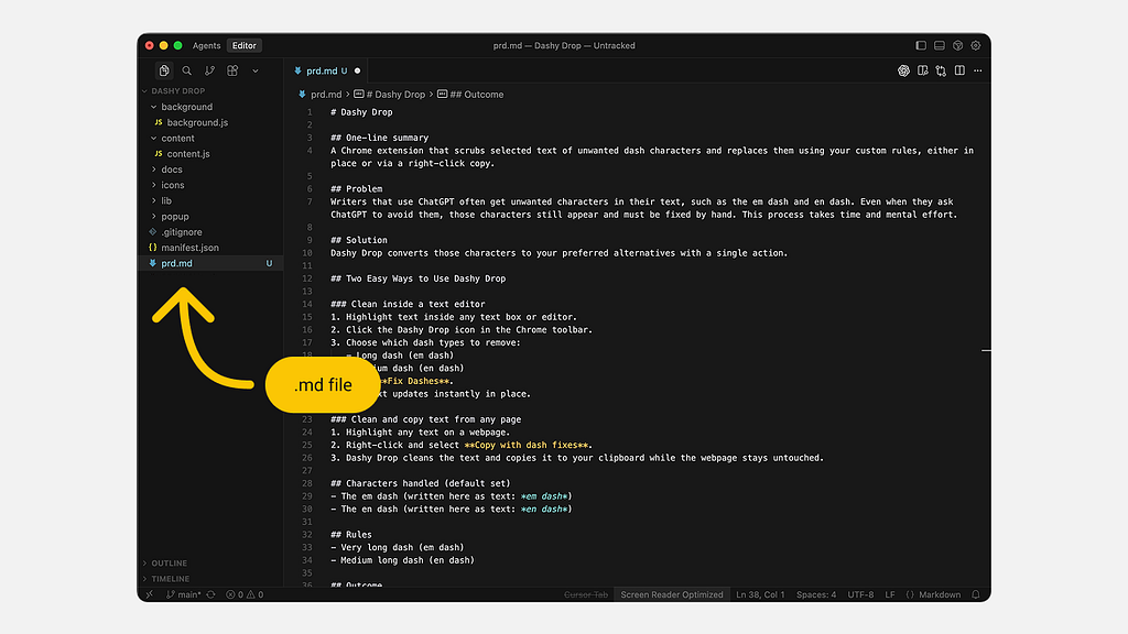 I started by creating a single Markdown file with the full PRD, what Dashy Drop does, why it exists, and how it should behave.