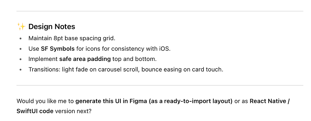 Quite interestingly, ChatGPT invites us to generate UI in Figma or as React Native/SwiftUI code. Recently, ChatGPT made it possible to tag Figma right in the prompt and ask it to generate something. I will test Figma integration later in this article.
