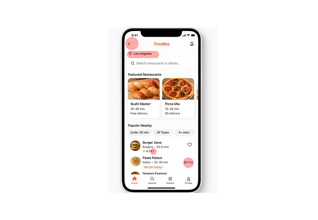 However, if you look closely, you will see some visual defects here and there. Such as — extra Back button at the top left corner of the screen, lack of visual indication for interactive elements like location selection and Search field, unnecessary elements for rating and price